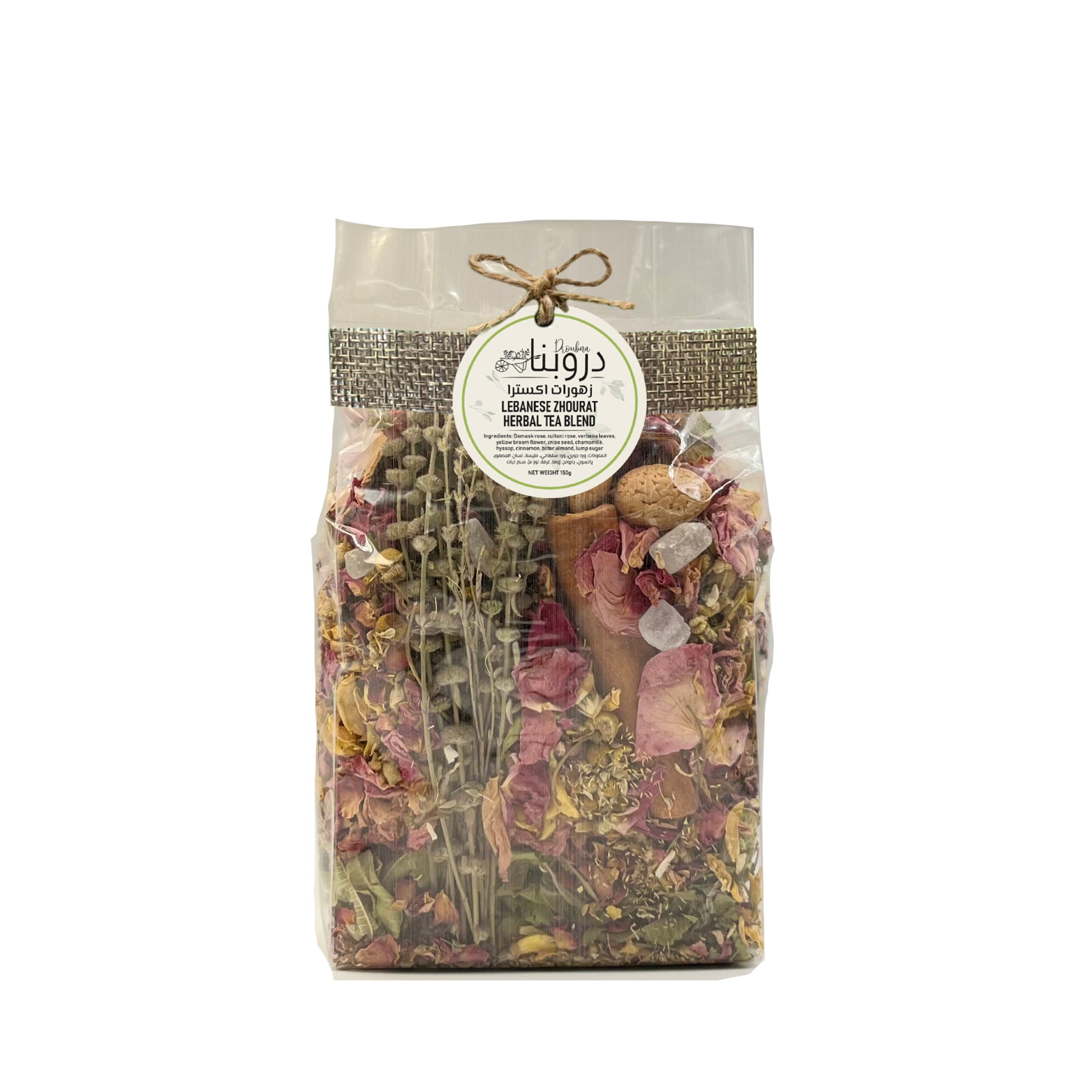 Naturally caffeine-free, our herbal tea (Zhourat) is a blend of traditional Lebanese herbs, picked and dried to produce a fully flavored cup of this aromatic, relaxing infusion.